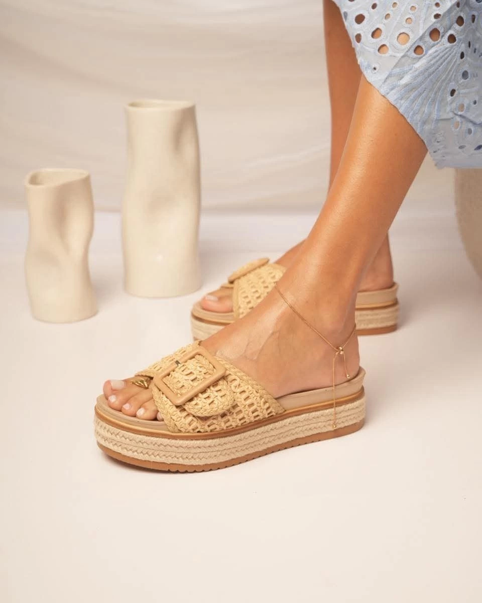 📏 La plataforma de aproximadamente 4 cm, forrada en yute, brinda una altura sutil que estiliza sin sacrificar confort. Además, la hebilla grande le otorga un detalle destacado y exclusivo.